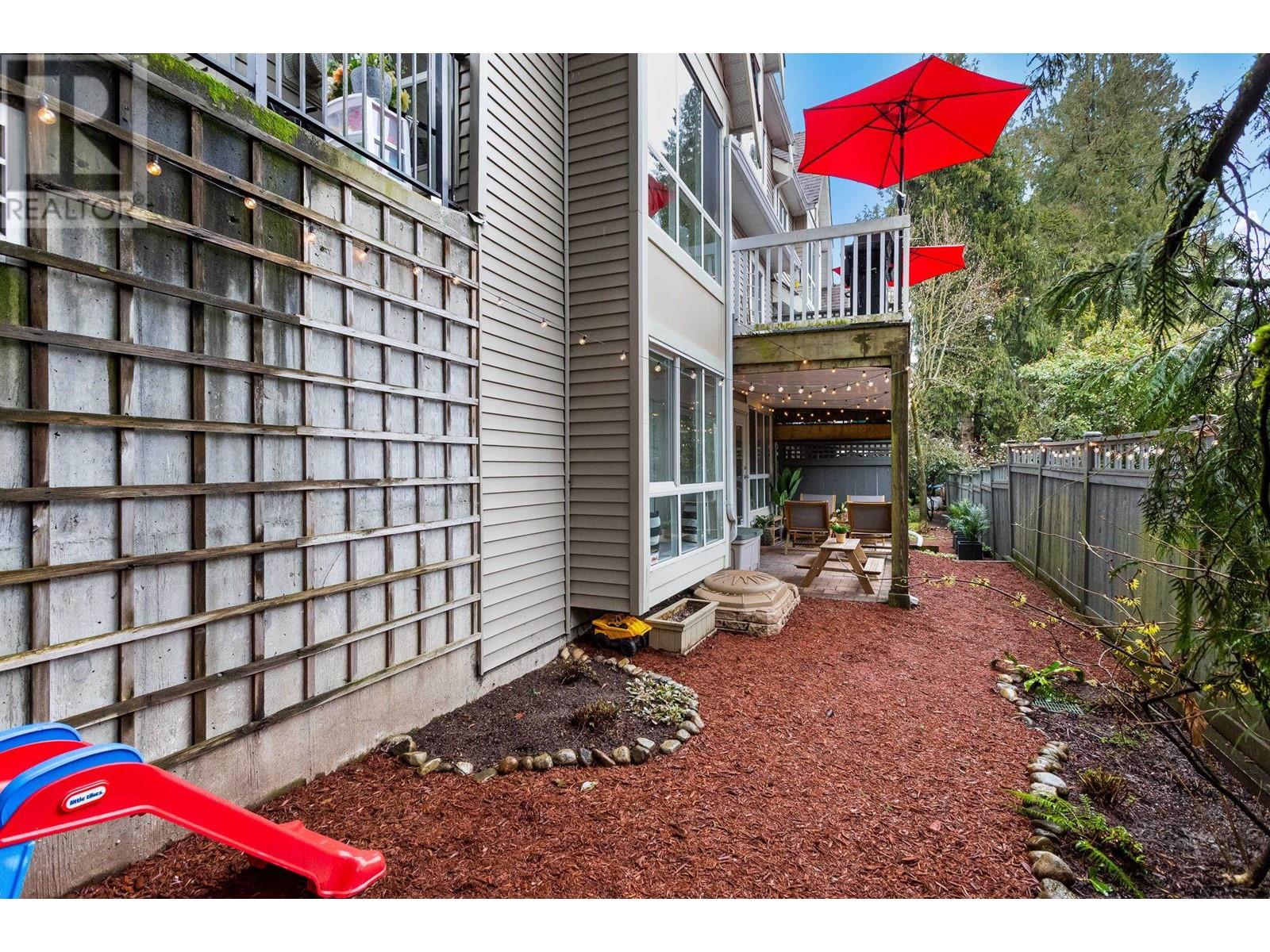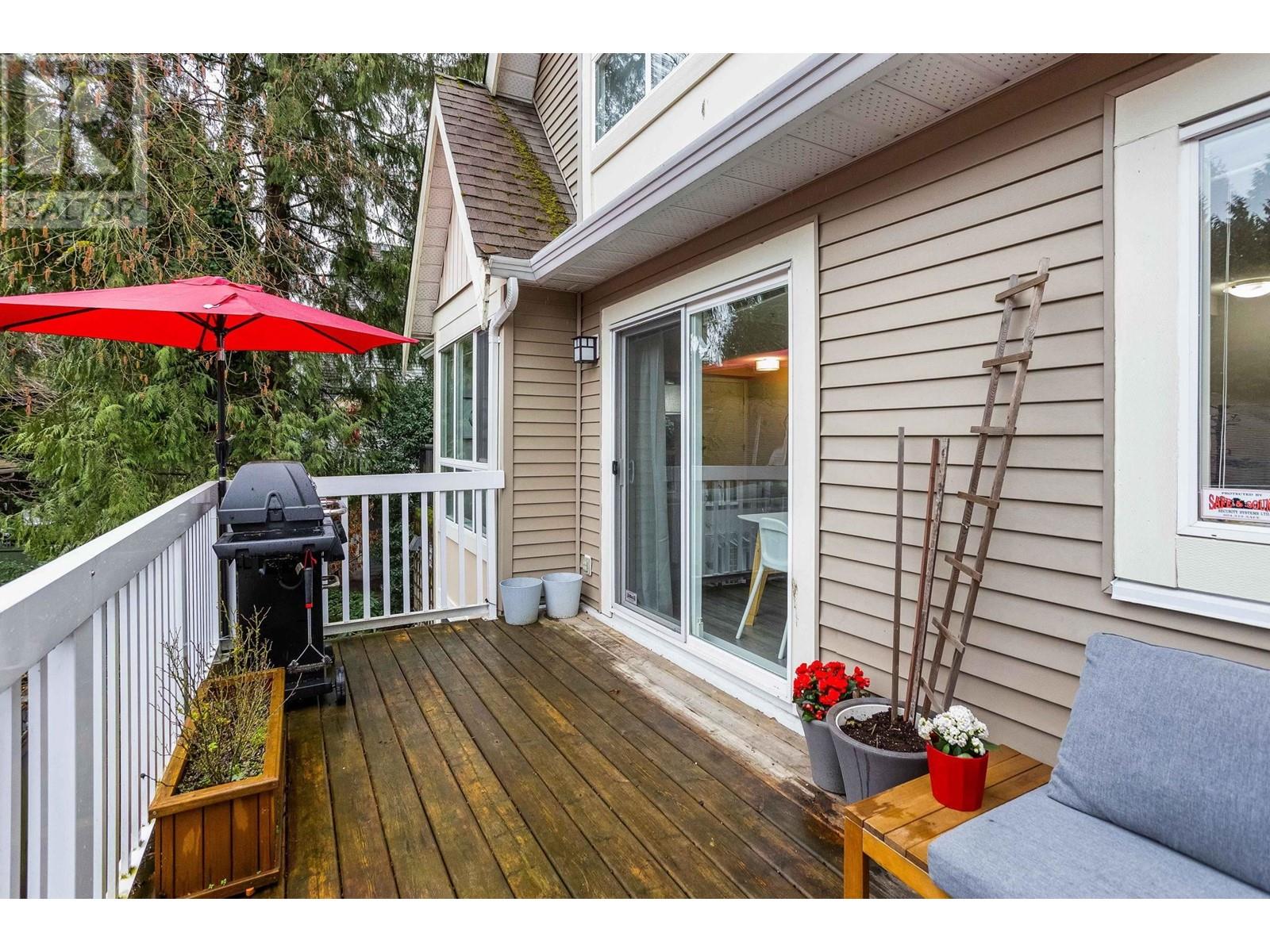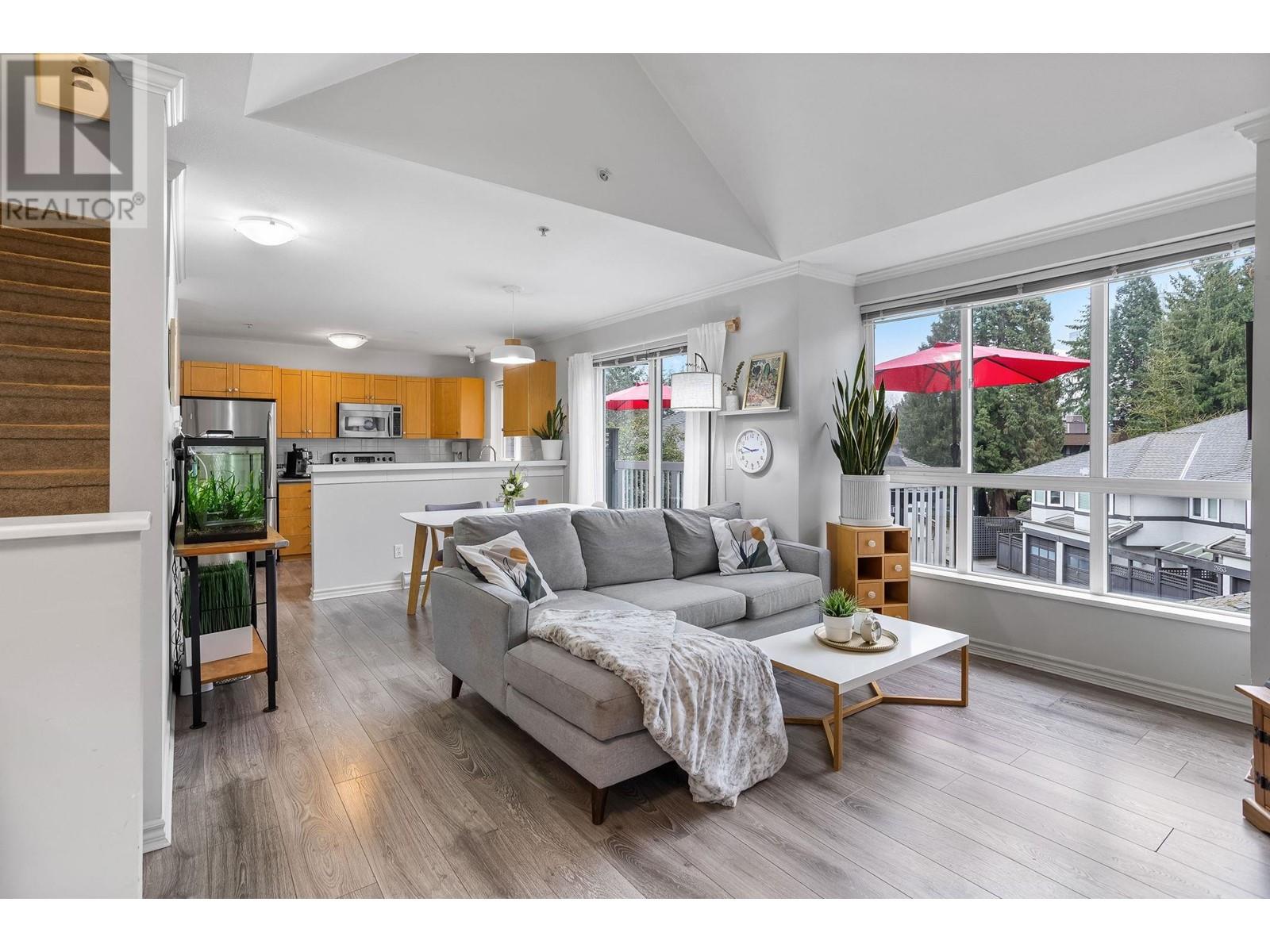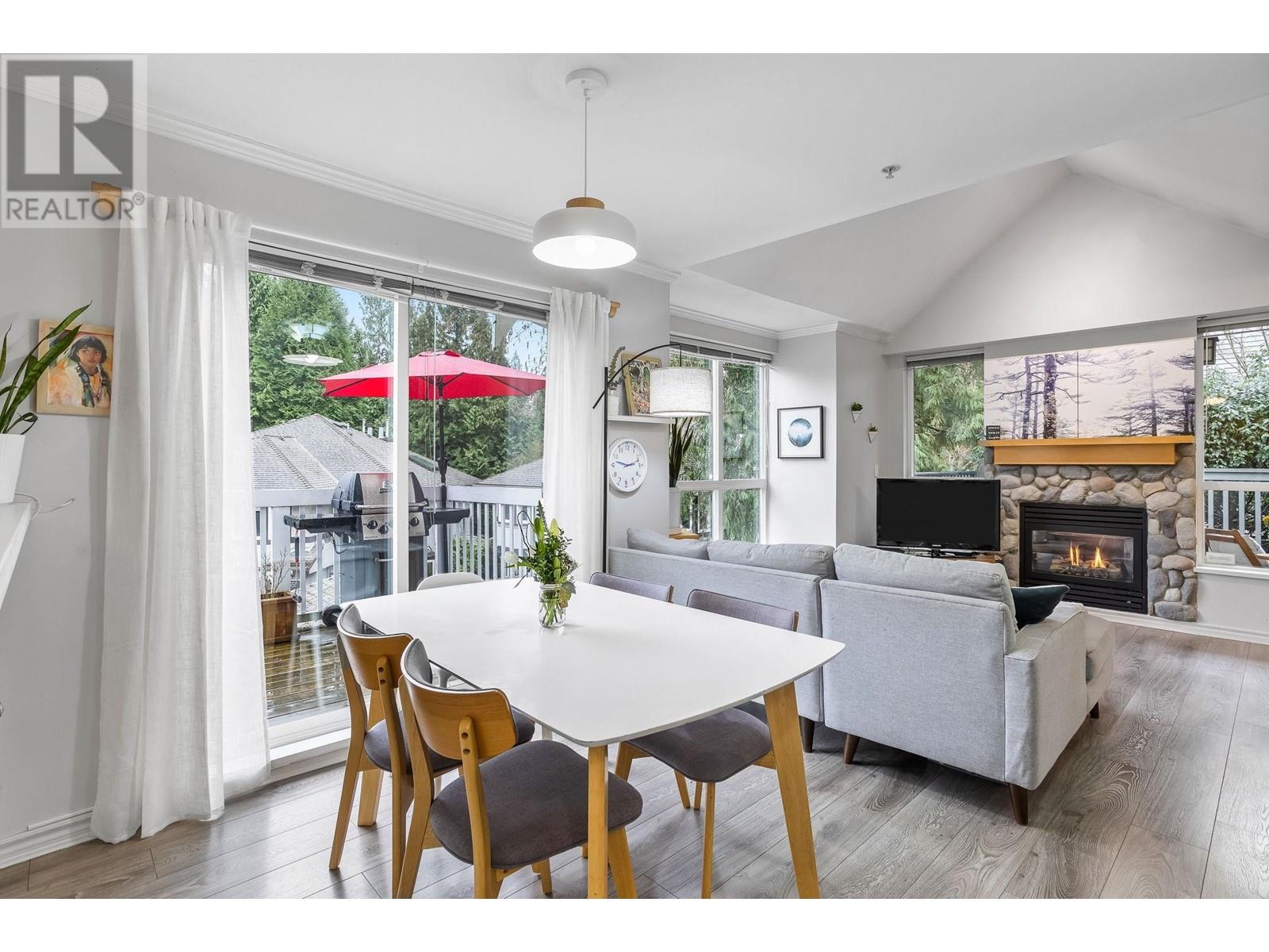 Private, end unit townhouse on the quiet side of the sought-after River Rock community! This beautiful 3-bed,2-bath residence offers two fantastic outdoor areas; a spacious deck off the main and a ground level patio opening up to a landscaped yard space for the kids to play! This centrally located Lynn Valley gem boasts updates including newer laminate, stainless steel appliances, and a new washer-dryer. As you walk in, beautiful, vaulted ceilings illuminate the interior with natural light. Upstairs, the primary is complete with a walk-in closet and ensuite. Downstairs offers two additional bedrooms, laundry and a storage room. Complete with 2 parking, bike rack, storage locker. A short walk from LV Centre, trails, parks, & schools. OPEN Sunday June 1st, 2-4PM (id:62103)