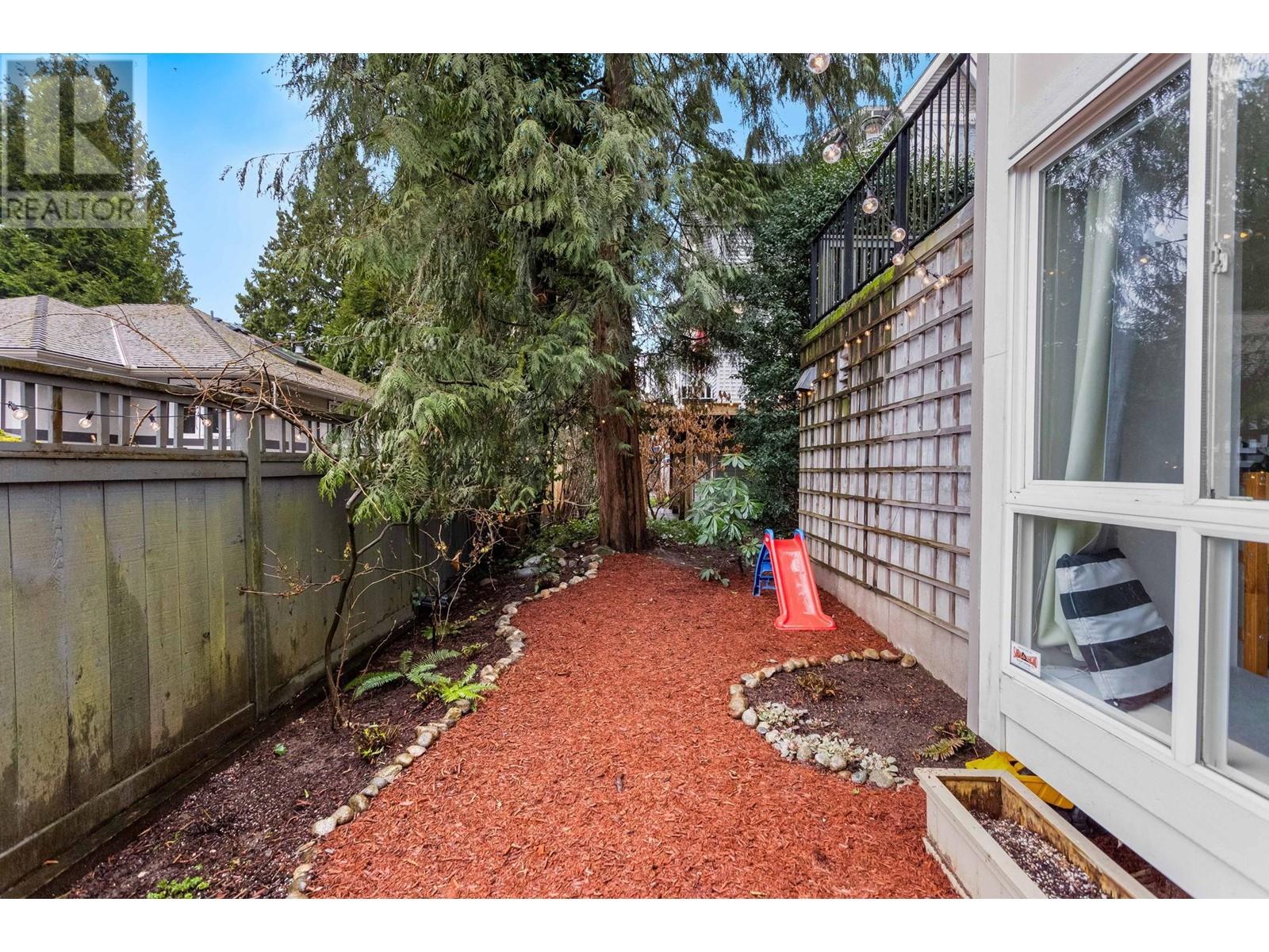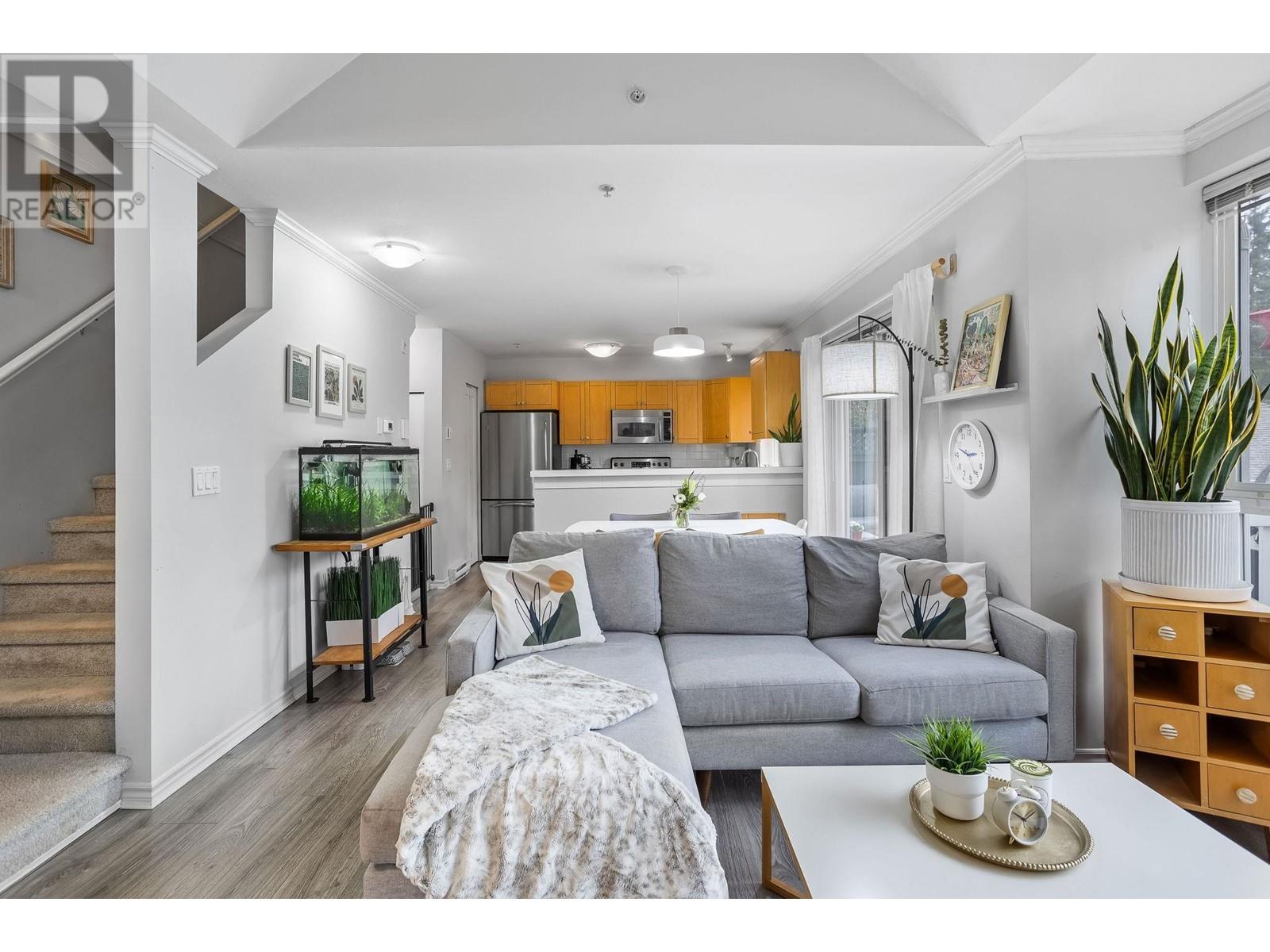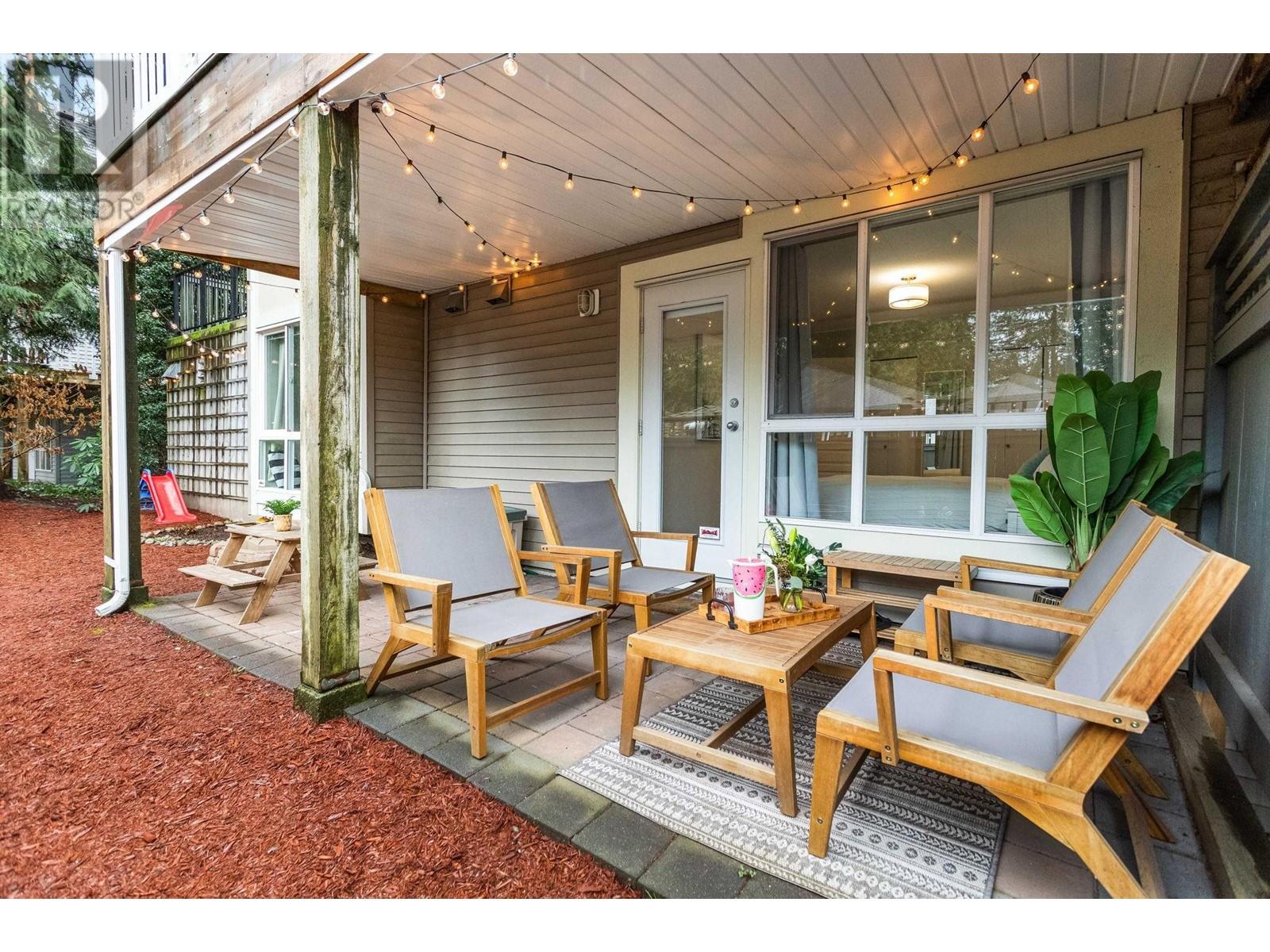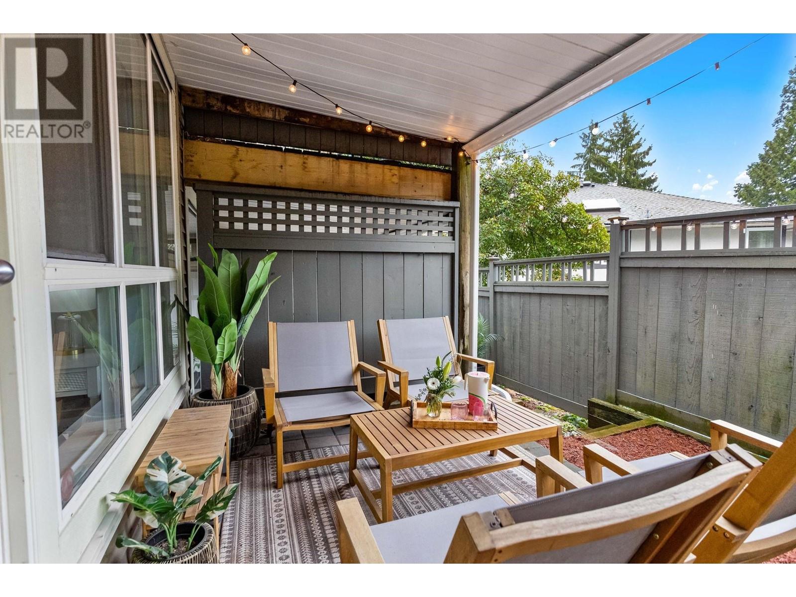 Private, end unit townhouse on the quiet side of the sought-after River Rock community! This beautiful 3-bed,2-bath residence offers two fantastic outdoor areas; a spacious deck off the main and a ground level patio opening up to a landscaped yard space for the kids to play! This centrally located Lynn Valley gem boasts updates including newer laminate, stainless steel appliances, and a new washer-dryer. As you walk in, beautiful, vaulted ceilings illuminate the interior with natural light. Upstairs, the primary is complete with a walk-in closet and ensuite. Downstairs offers two additional bedrooms, laundry and a storage room. Complete with 2 parking, bike rack, storage locker. A short walk from LV Centre, trails, parks, & schools. OPEN Sunday June 1st, 2-4PM (id:62103)