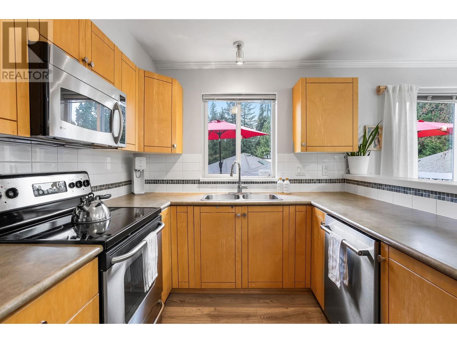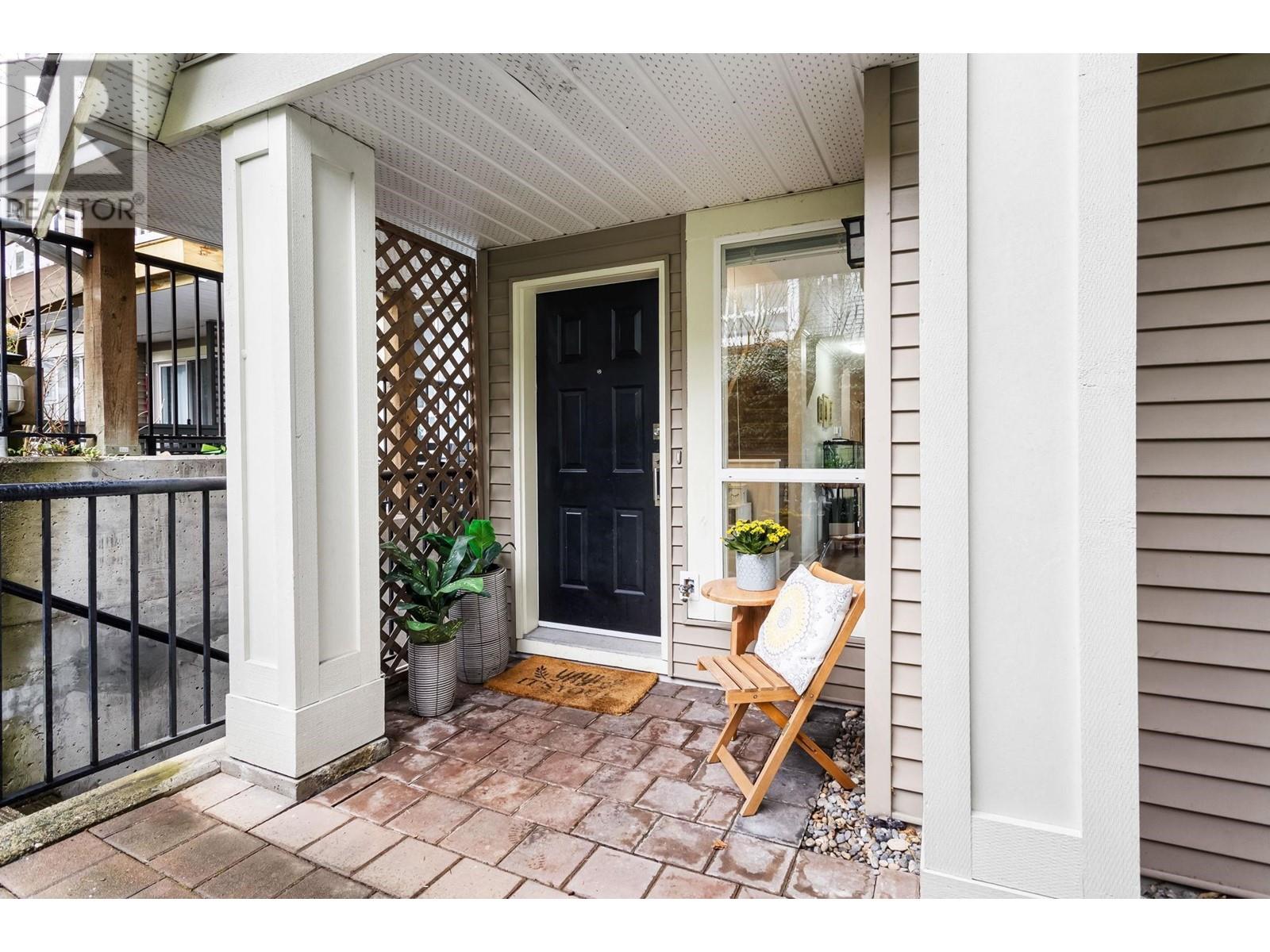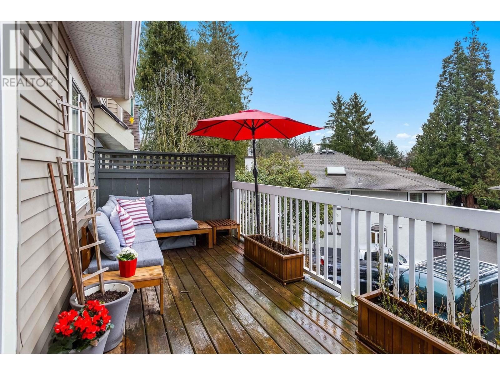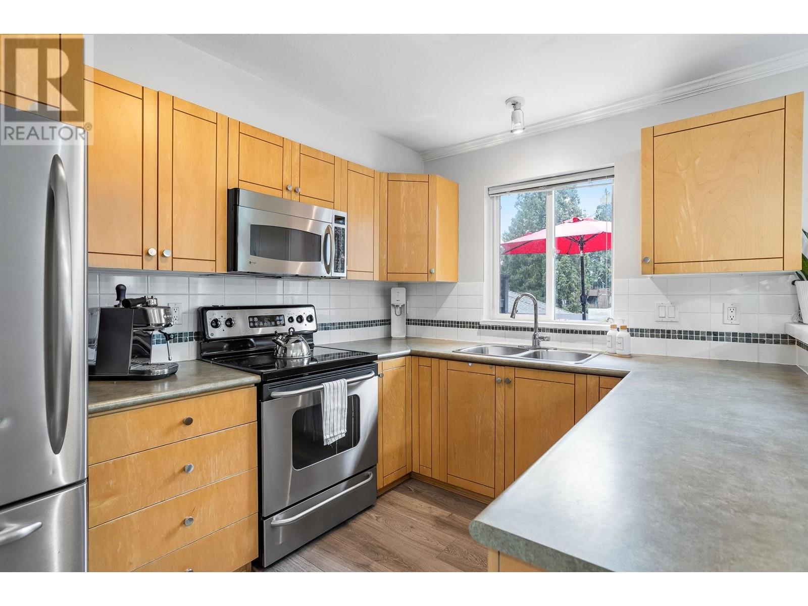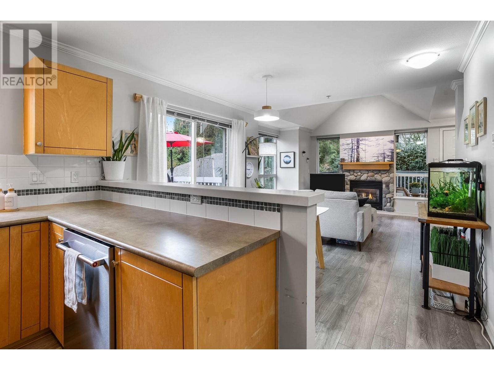 Private, end unit townhouse on the quiet side of the sought-after River Rock community! This beautiful 3-bed,2-bath residence offers two fantastic outdoor areas; a spacious deck off the main and a ground level patio opening up to a landscaped yard space for the kids to play! This centrally located Lynn Valley gem boasts updates including newer laminate, stainless steel appliances, and a new washer-dryer. As you walk in, beautiful, vaulted ceilings illuminate the interior with natural light. Upstairs, the primary is complete with a walk-in closet and ensuite. Downstairs offers two additional bedrooms, laundry and a storage room. Complete with 2 parking, bike rack, storage locker. A short walk from LV Centre, trails, parks, & schools. OPEN Sunday June 1st, 2-4PM (id:62103)