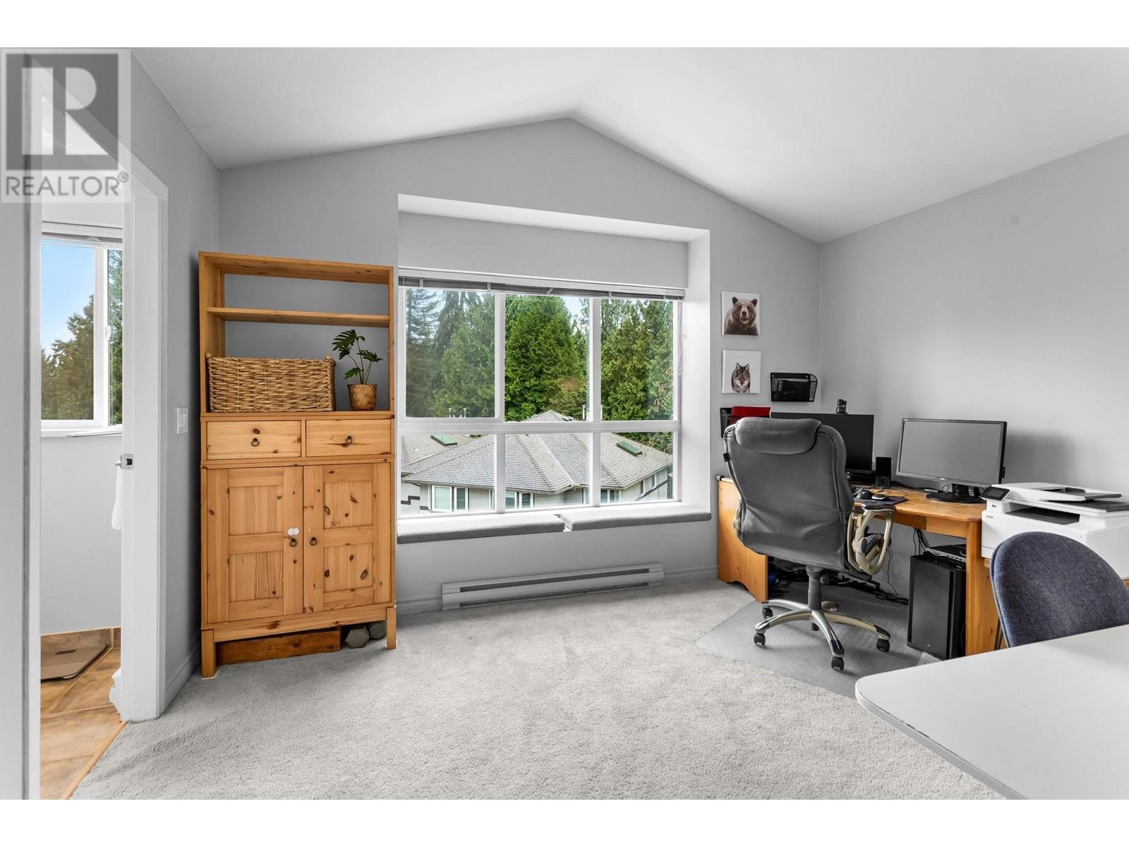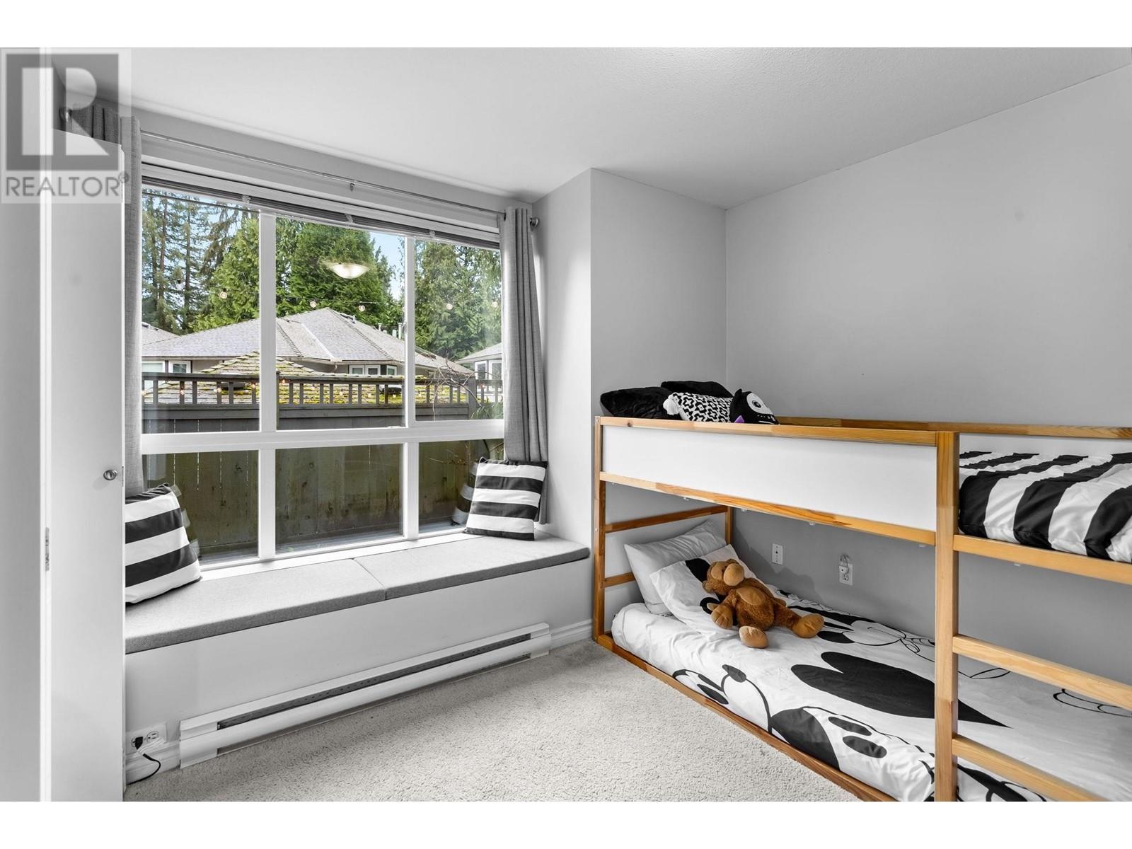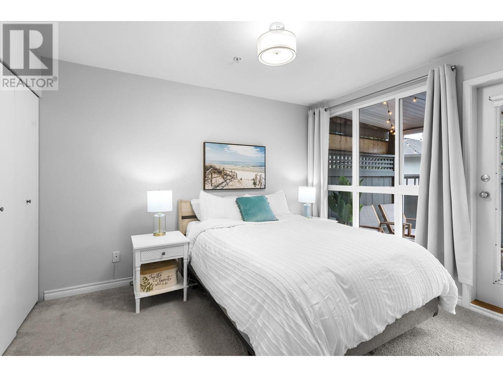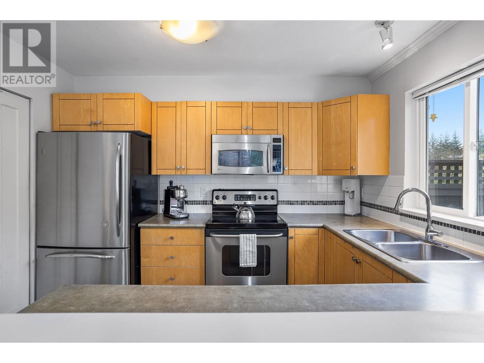 Private, end unit townhouse on the quiet side of the sought-after River Rock community! This beautiful 3-bed,2-bath residence offers two fantastic outdoor areas; a spacious deck off the main and a ground level patio opening up to a landscaped yard space for the kids to play! This centrally located Lynn Valley gem boasts updates including newer laminate, stainless steel appliances, and a new washer-dryer. As you walk in, beautiful, vaulted ceilings illuminate the interior with natural light. Upstairs, the primary is complete with a walk-in closet and ensuite. Downstairs offers two additional bedrooms, laundry and a storage room. Complete with 2 parking, bike rack, storage locker. A short walk from LV Centre, trails, parks, & schools. OPEN Sunday June 1st, 2-4PM (id:62103)