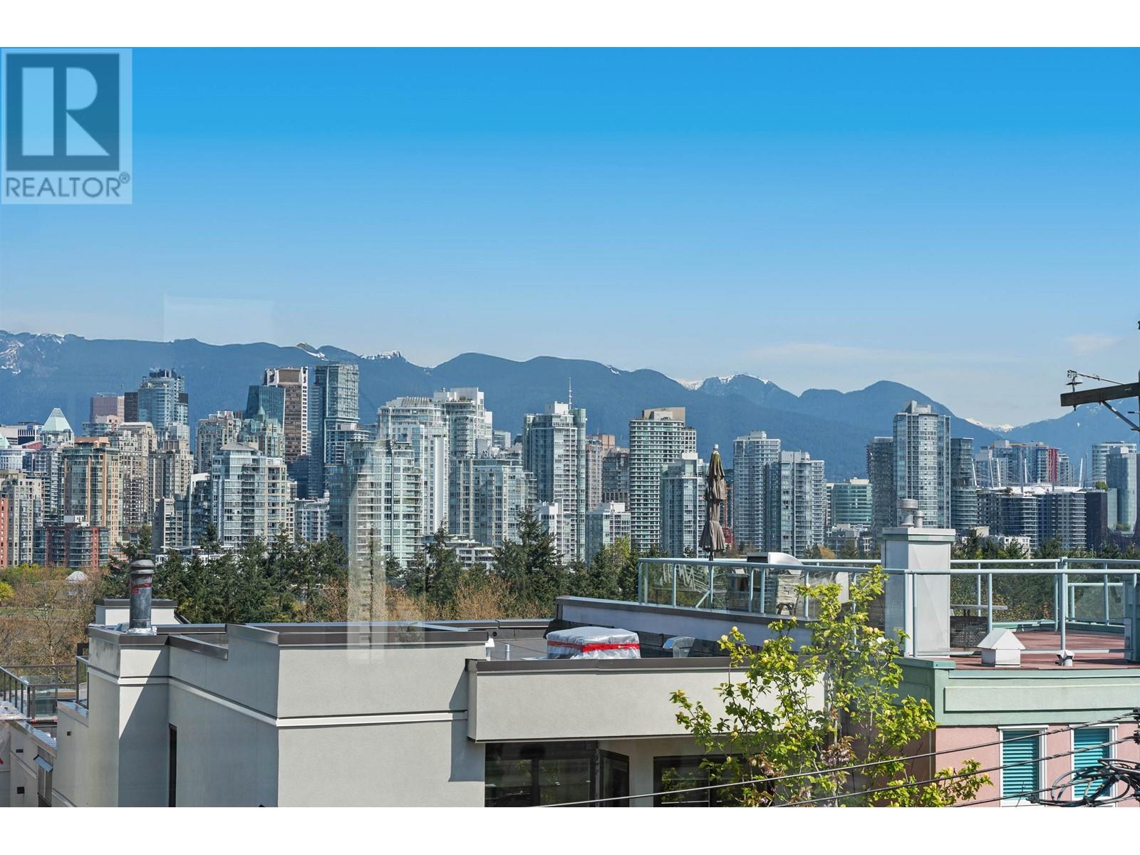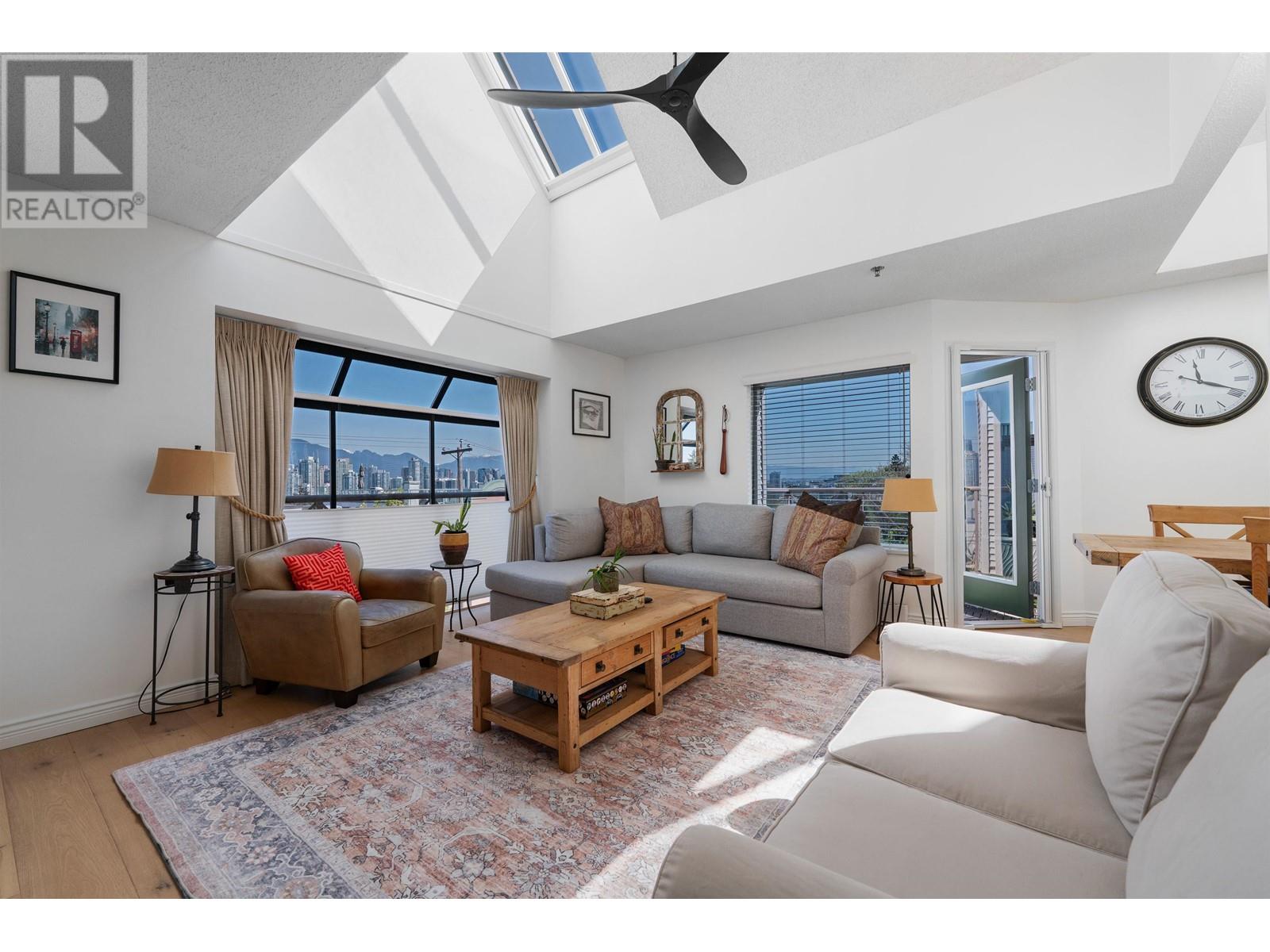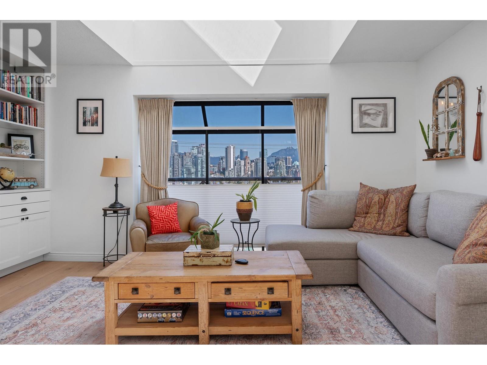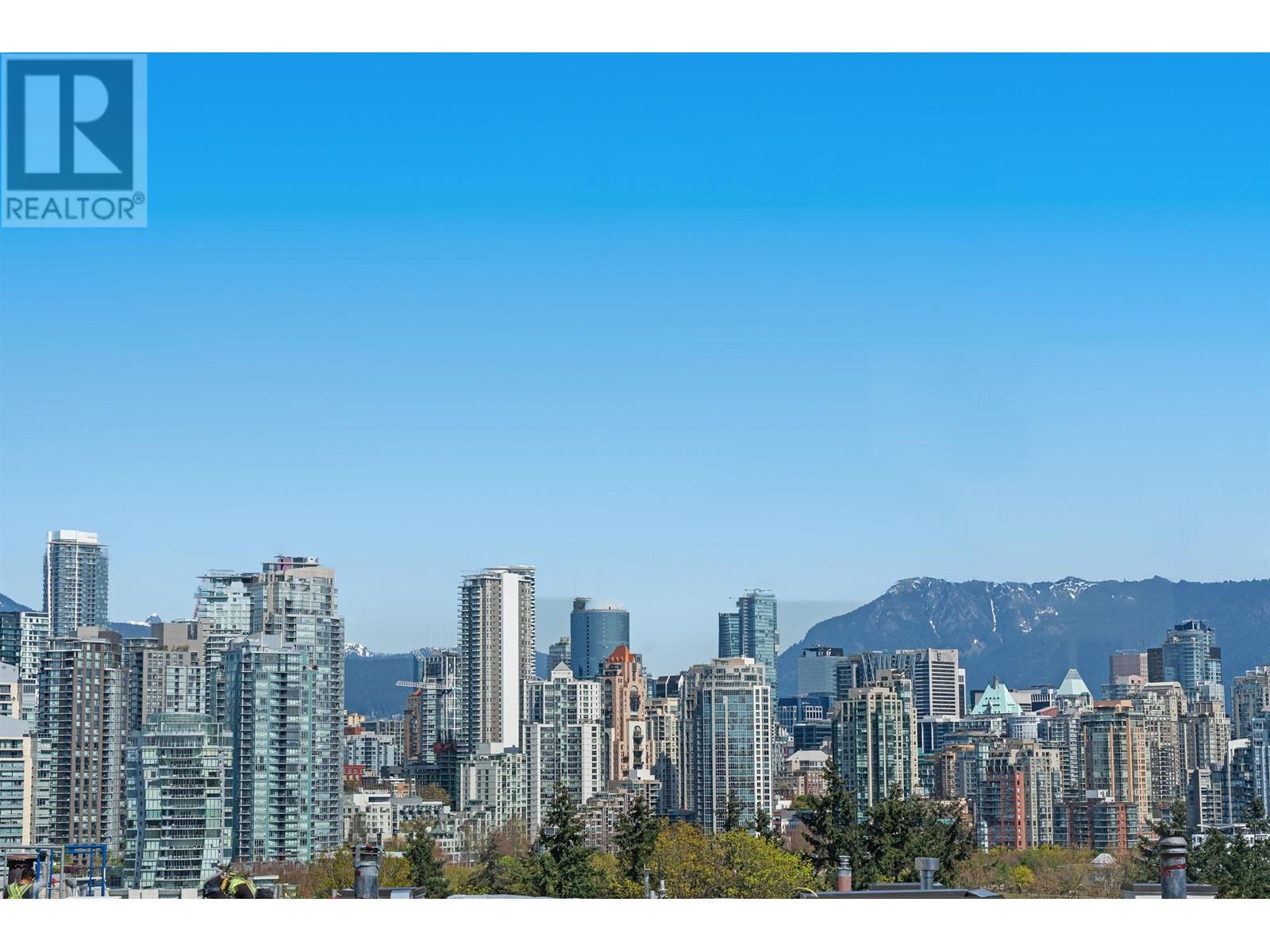 This home will make your heart sing! Only the 2nd time on the market, this rarely available top-floor corner loft-style condo has been completely renovated and offers two thoughtfully designed levels & sweeping NE VIEWS of downtown & the north shore mountains. Soaring 17 foot vaulted ceilings, skylights, and a gas fireplace create a bright, airy feel with fantastic cross-breeze year-round. Bedrooms are on separate floors, including a spacious primary with patio access. Tasteful updates to the kitchen, bathrooms, and H/W flooring enhance style and function. Bosch appliances, blackout blinds, California Closets, and bonus crawl space add everyday ease. Includes in-suite laundry, 2 parking, locker, and more- all just steps to the future Oak-VGH Broadway Station, Seawall and the best cafés! (id:62103)