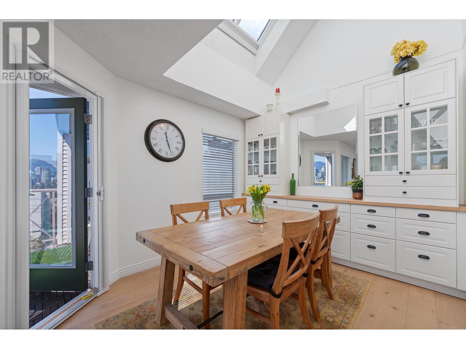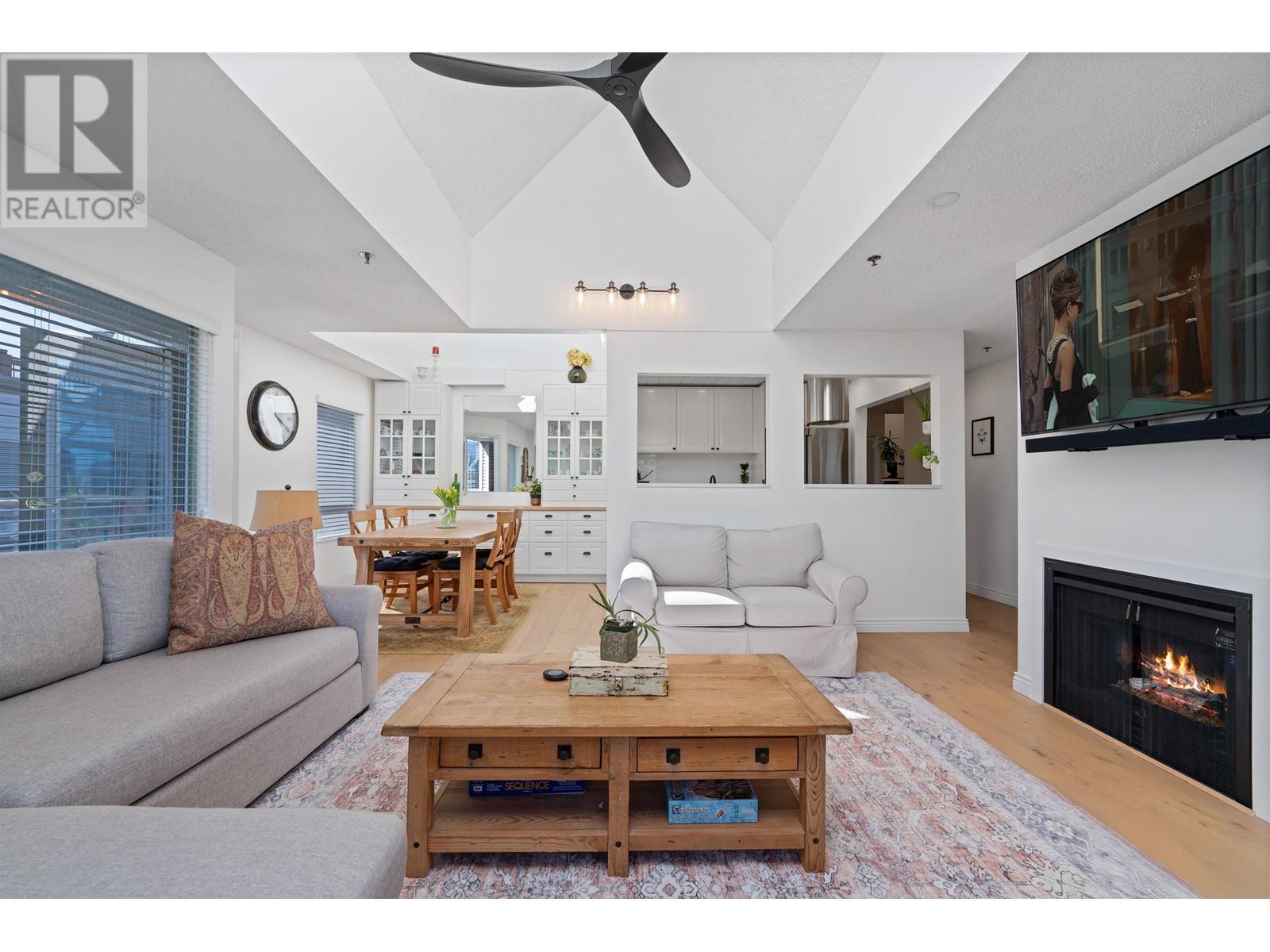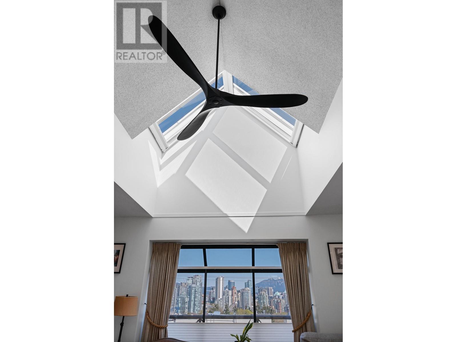 This home will make your heart sing! Only the 2nd time on the market, this rarely available top-floor corner loft-style condo has been completely renovated and offers two thoughtfully designed levels & sweeping NE VIEWS of downtown & the north shore mountains. Soaring 17 foot vaulted ceilings, skylights, and a gas fireplace create a bright, airy feel with fantastic cross-breeze year-round. Bedrooms are on separate floors, including a spacious primary with patio access. Tasteful updates to the kitchen, bathrooms, and H/W flooring enhance style and function. Bosch appliances, blackout blinds, California Closets, and bonus crawl space add everyday ease. Includes in-suite laundry, 2 parking, locker, and more- all just steps to the future Oak-VGH Broadway Station, Seawall and the best cafés! (id:62103)