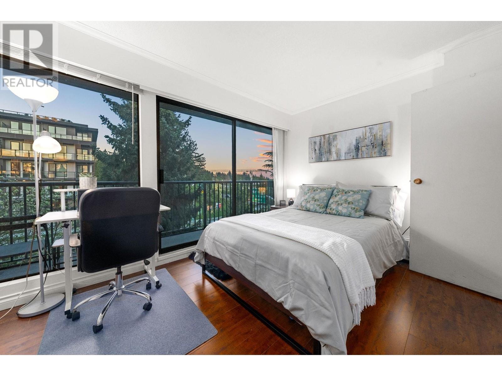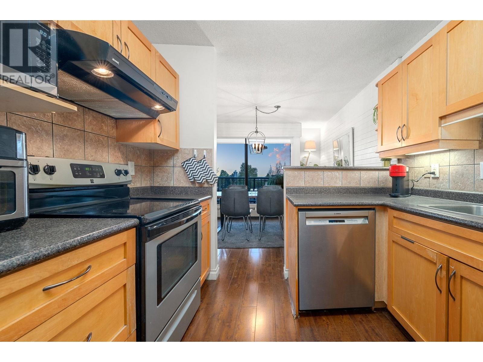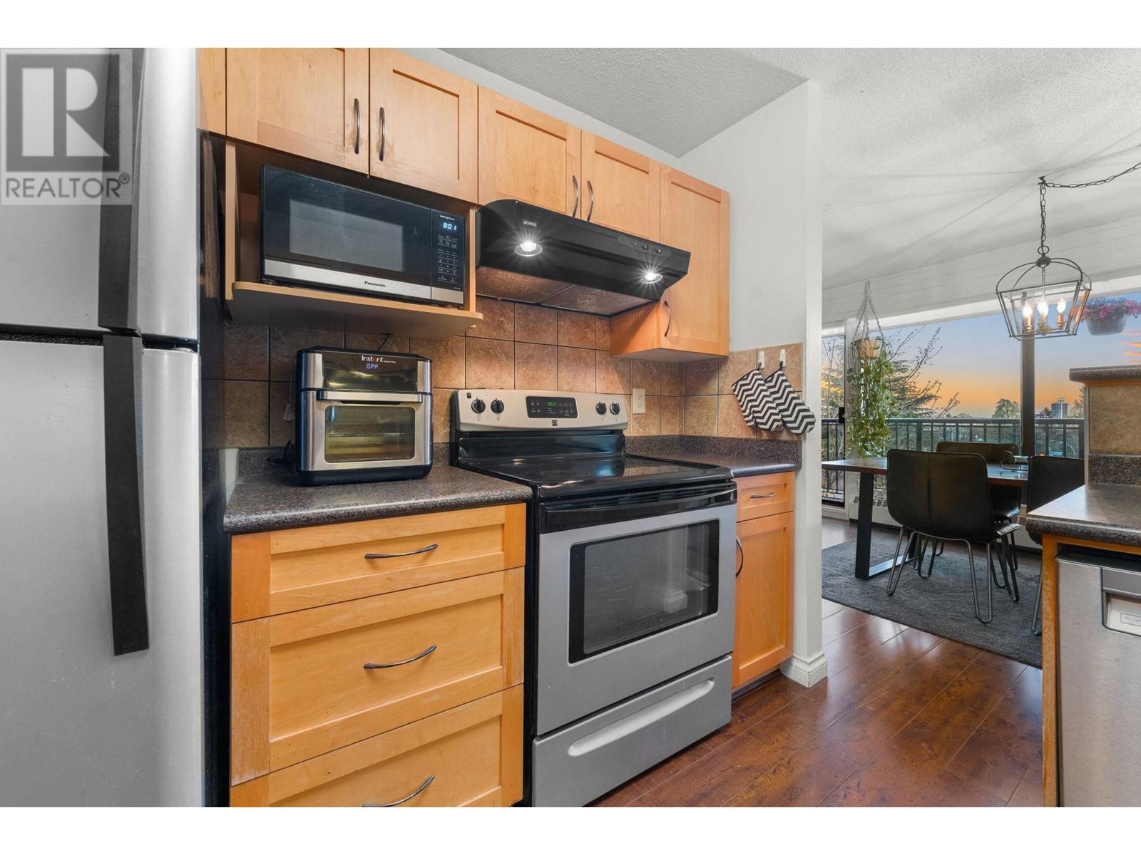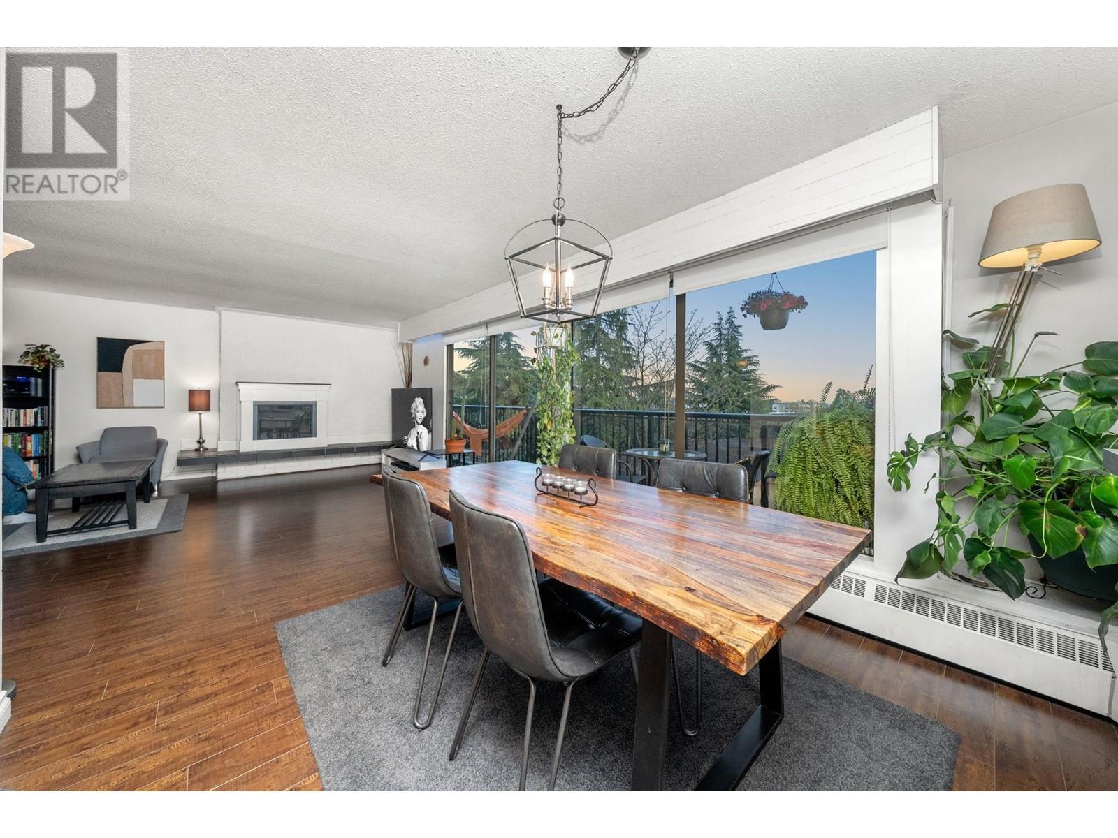 Stunning penthouse at the top of Lonsdale with breathtaking views of the Vancouver skyline! This sun-drenched, south-facing corner unit offers 1,147 sqft of beautifully renovated space, featuring 2 large bedrooms & 2 bathrooms. The primary bedroom includes a private ensuite. Enjoy a very spacious living room with a cozy fireplace and stunning views of the city and ocean from the wraparound balcony, perfect for soaking in the scenery. Updated kitchen with stainless steel appliances. House sized laundry room, 1 parking space, and a storage locker in a very well-maintained Upper Lonsdale building. A rare opportunity to own a bright and airy home in a prime location with easy access to the highway and half a block away from the new Harry Jerome Community Recreation Centre! (id:62103)