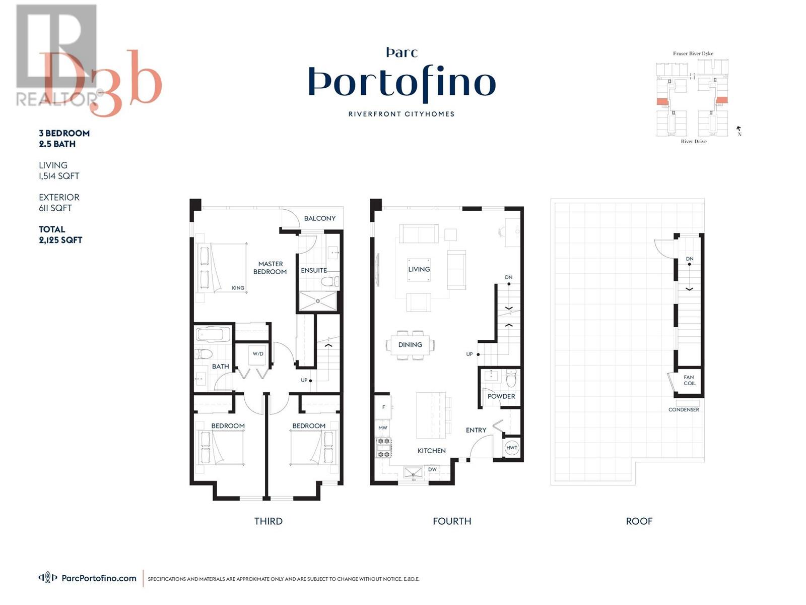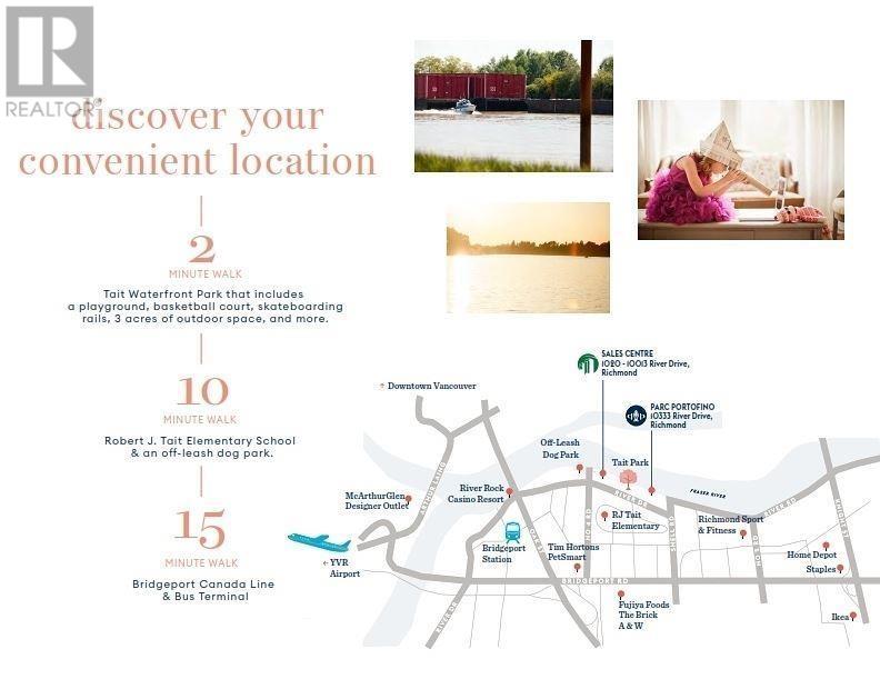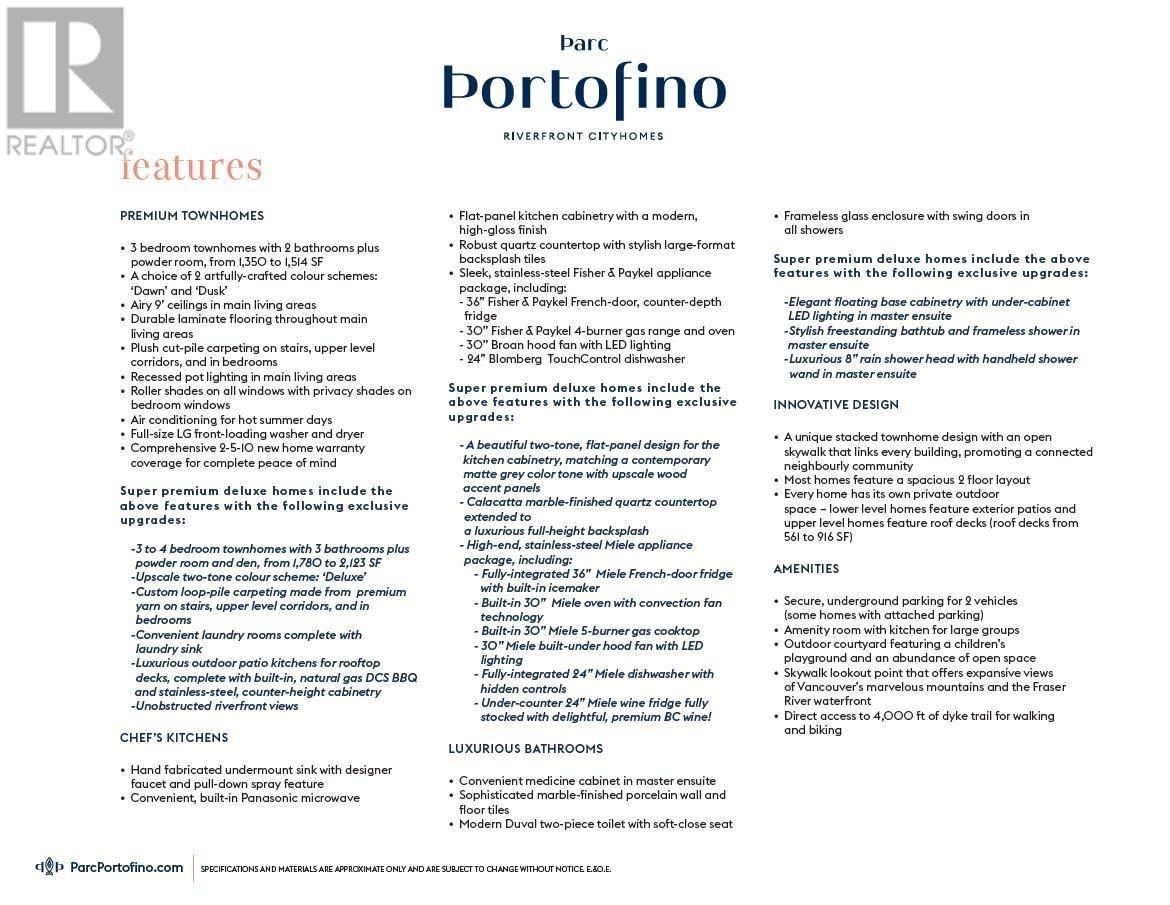RARE Brand New CORNER DUPLEX-style townhome with a Rooftop deck with River and Panoramic Views at Parc Portofino by Dava Developments. Boasting 1514 SF of spacious living + 611 Sf of outdoor space, this air-conditioned, 3 bedrooms, 2.5 bath townhome offers 9 ft ceilings on the main level, laminate floors, gourmet kitchen with island, stainless steel appliances, quartz counters, seamless glass shower enclosures, roller shades, full size washer & dryer and 2 secured parking. This “cityhome” is located on the top 2 floors of a great complex with unique upper level skywalks and 2/5/10 year new home warranty for peace of mind. Close to the riverfront boardwalk, parks, transit, Tait Elementary & Cambie Secondary. Great pre-sale opportunity estimated to complete May-July 2025. (id:62103)